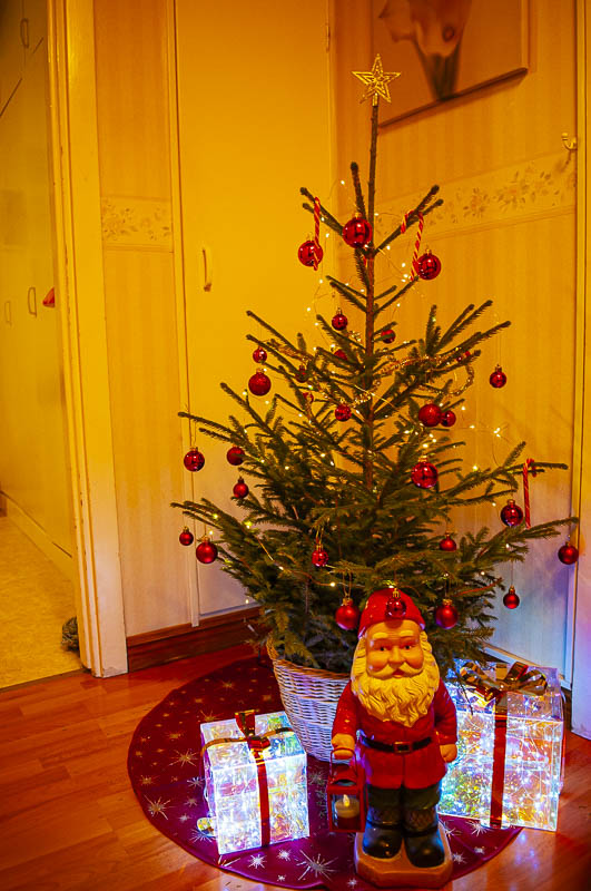 Här står vår lilla julgran, i den hänger röda julkulor.