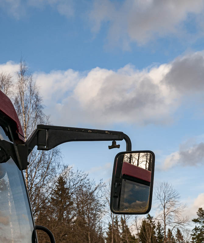 Sidospegeln på traktorn, stora och tydliga. Bra att kunna se bra bakom traktorn vid körning på vägen.