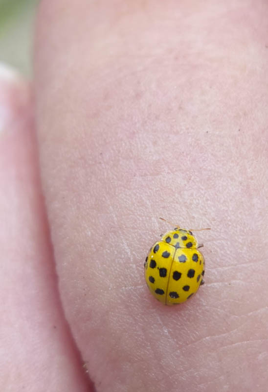 Denna gula nyckelpiga satt på min tå häromdagen. Förmodligen en 22-prickig nyckelpiga en art i skalbaggar som tillhör familjen nyckelpigor.