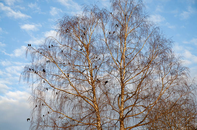 Igår blev det ett fruktansvärt tjatter på utsidan huset. Och när jag sedan såg ut flög fåglarna upp och satte sig i trädet för att konferera.