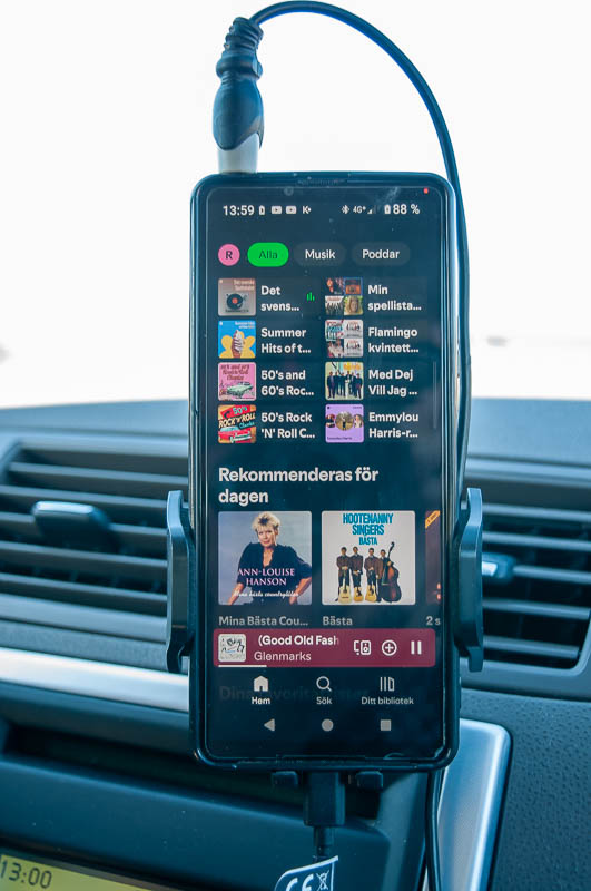När man inte har en nyare bil med dator i, får man använda sin telefon för att få musik i bilen via spotify.