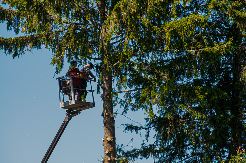 Dessa pojkar arbetar under kronorna när de plockar ner träden bit för bit. Där de börjar uppifrån.
