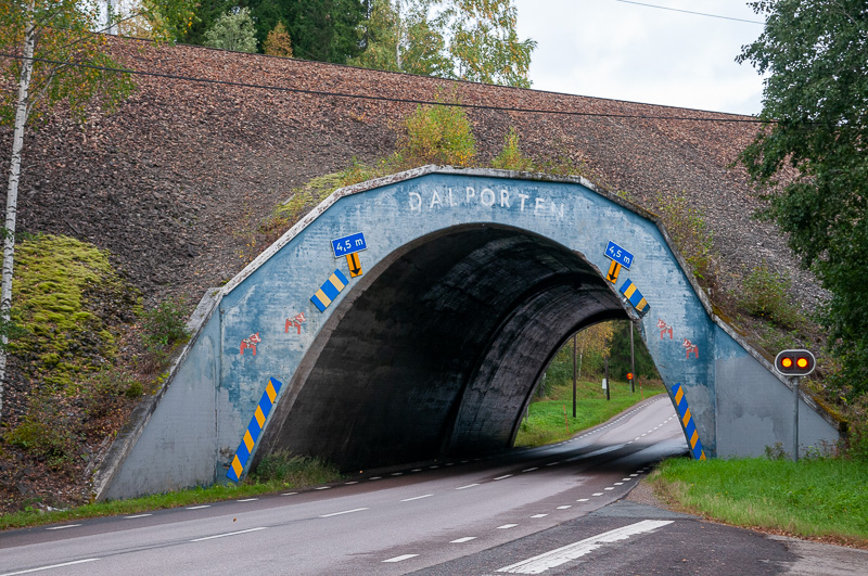 Dalportan i Grängesberg är så smal upptill så att det är stopp när en mötande hög lastbil kommer från andra hållet, den måste köra i mitten av vägen. De gula ljusen varnar för hög lastbil. Det är järnvägen som går ovanför.